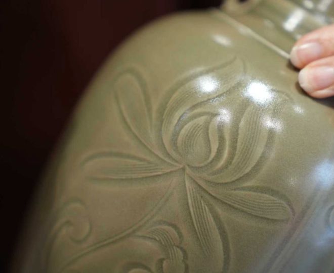 这件作品曾获第三届中国浙江工艺美术精品博览会金奖,被国内某大博物馆收藏,入选由西泠印社出版、张晞主编的《龙泉青瓷传统隆尧烧制技艺》,此次柴烧器型、纹饰略有不同。