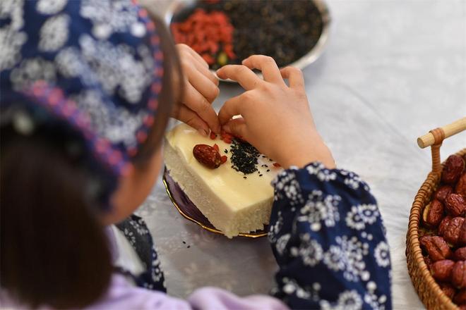 2025年10月29日,在山东省青岛市城阳区棘洪滩街道中心幼儿园开展的重阳传统文化体验活动上,小朋友在学做重阳糕。王海滨摄