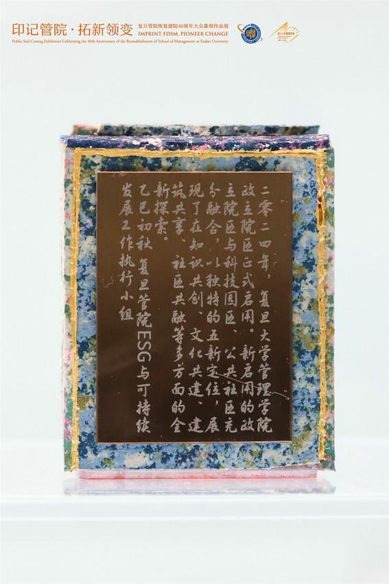 本次展览以商科发展历史为引,以“印记管院 拓新领变”为题,包括了“商科初创”、“发展变迁”、“拓新领变”、“求真卓越”、“缅怀与感恩”,“我是复旦人”六个展区。从传统材料到光敏树脂、玻璃微珠等新材料,从手工镌刻到激光雕刻、3D打印、彩色喷绘等新方法,展览作品以新理念、新设计、新材料和新科技,展现了篆刻艺术的时代感与大众性。