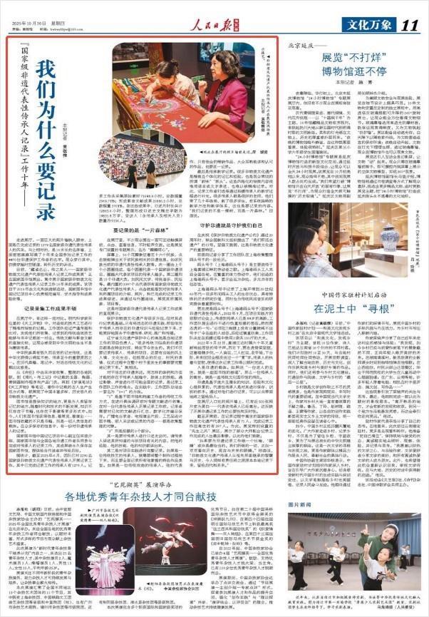 目前,“藏诸名山,传之其人——国家级非物质文化遗产代表性传承人记录工作成果展”正在国家图书馆展出,集中展示国家级非物质文化遗产代表性传承人记录工作10年来的成果。该项目于2015年由文化和旅游部启动,国家图书馆中国记忆项目中心负责规范编写、学术指导和成果验收等。