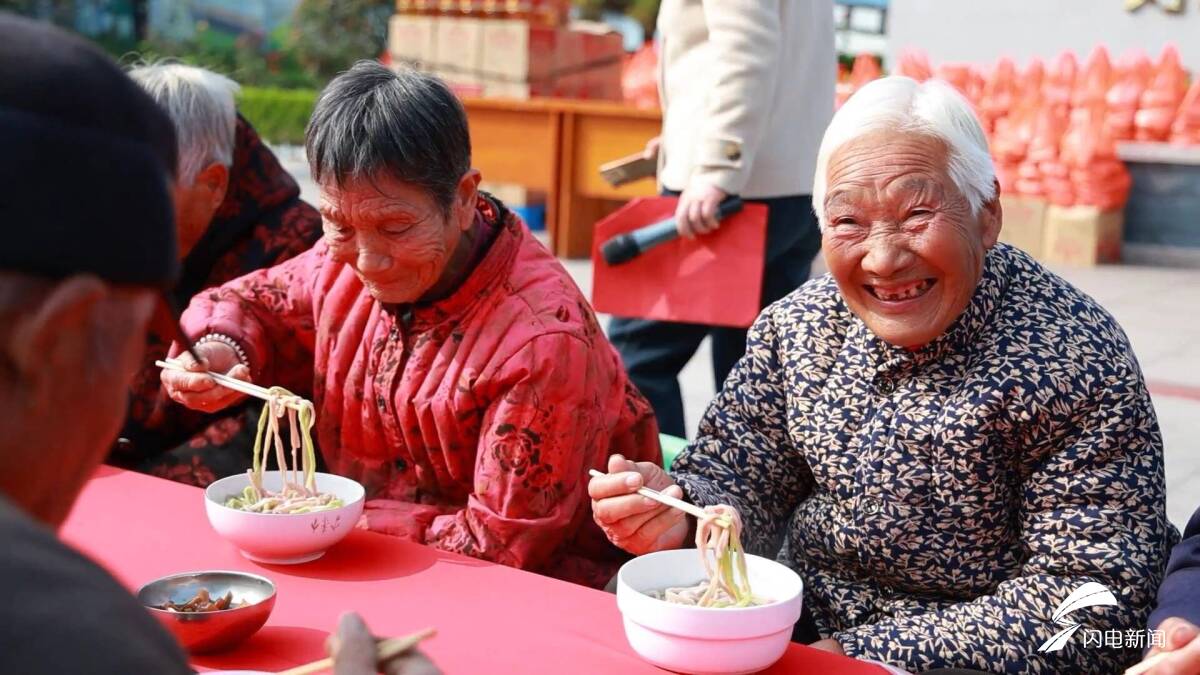 经过反复揉压、醒发、擀面、切条,一根根色泽鲜艳、粗细均匀的面条逐渐成型。锅中水沸,面条下锅翻滚,不一会儿,一碗碗热气腾腾、寓意吉祥的五彩长寿面便端到了老人们面前。200多位老人们围坐在桌前,欣赏着文艺节目,拉家常,话幸福,百年习俗演绎出尊老敬老的欢乐盛宴。