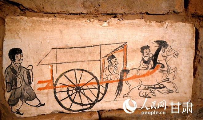 骆驼城苦水1号墓复原墓葬—车马出行图壁画砖(复制品)。