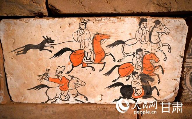 骆驼城苦水1号墓复原墓葬—射猎图壁画砖(复制品)。
