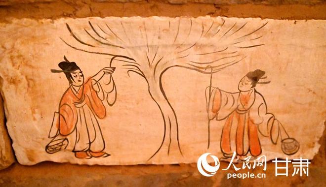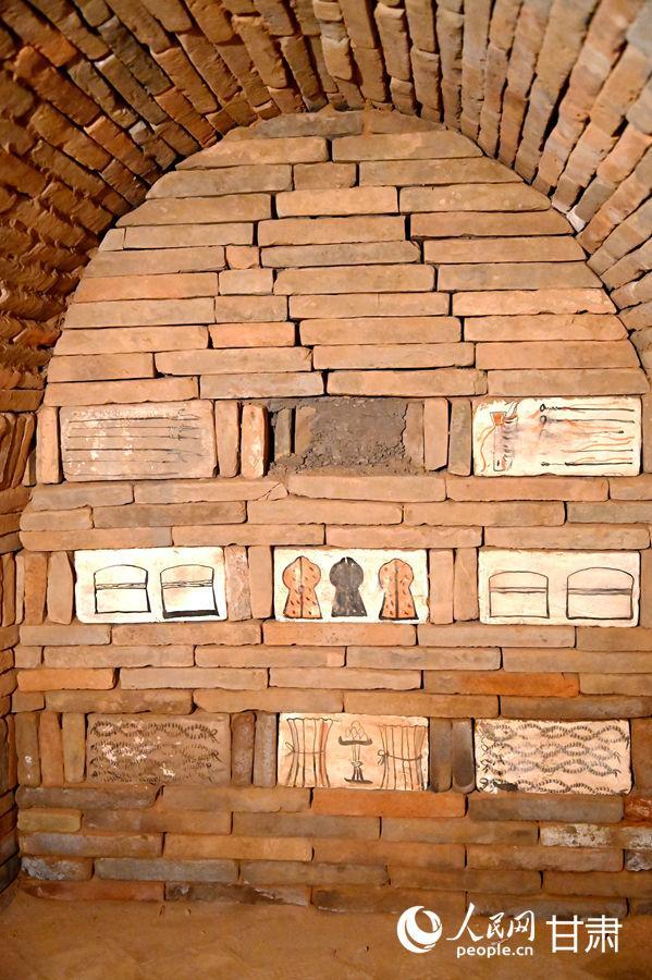 骆驼城苦水1号墓复原墓葬—采桑图壁画砖(复制品)。
