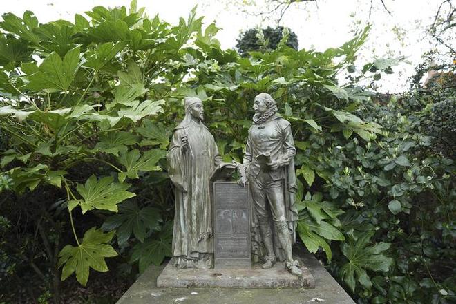 英国斯特拉特福镇莎士比亚故居花园内,有一座莎士比亚和汤显祖并排站立的塑像。(吴鲁 摄)