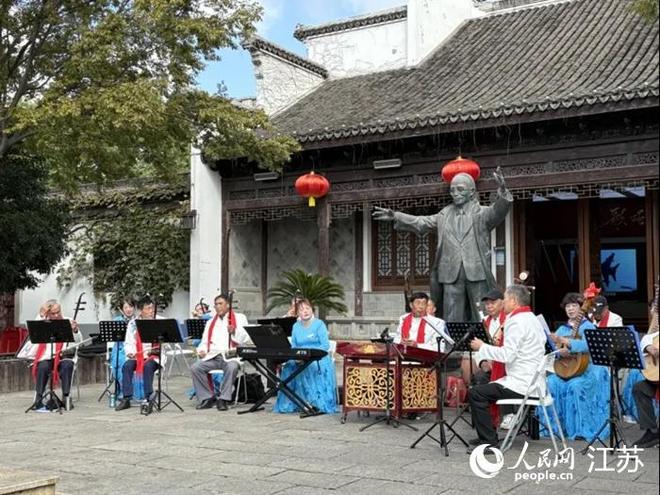 荡口古镇民族音乐团在王莘雕像前演出。人民网 刘益佳摄