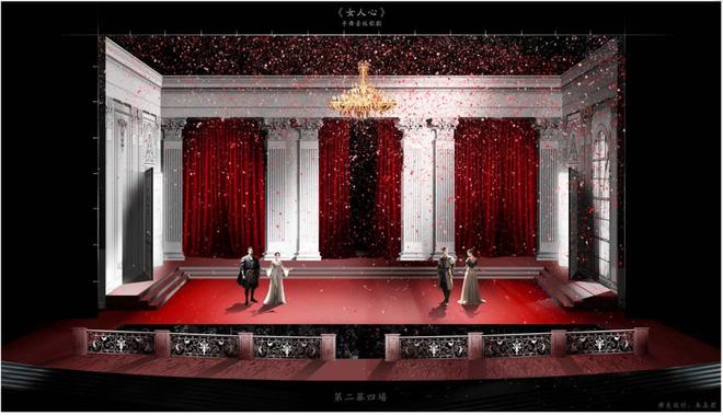 舞台创新在细节中彰显巧思。舞美设计朱嘉君以浅灰色为主基调,用欧式建筑细节构建包围式表演空间,将演区延伸至乐池周围,打破了舞台与观众的界限。灯光设计刘沈辉则克服场地限制,通过加装桁架与高位灯杆等巧思,为扩展的表演区域提供精准照明,直径近3 米的水晶吊灯更将在关键场次营造震撼效果。服装设计刘佳玮用姜黄、酒红等鲜明的色彩与皮革、缎面材质碰撞,外化出角色内在与外表的强烈反差。