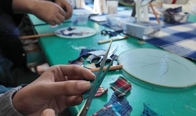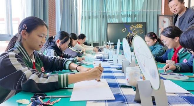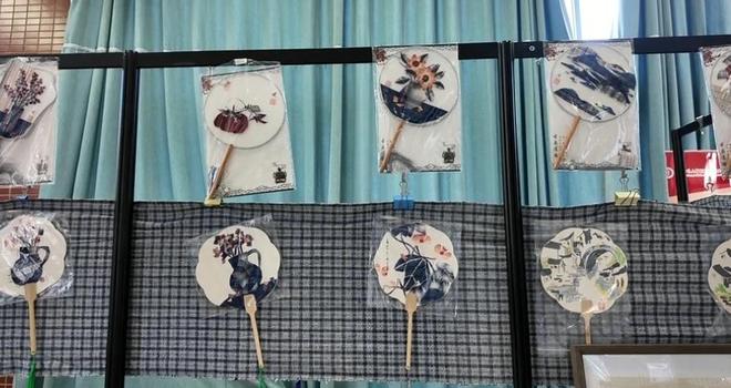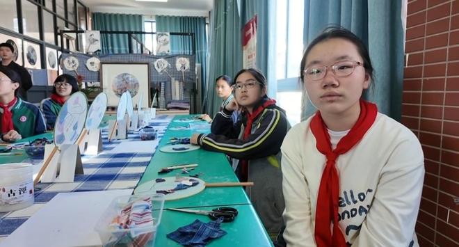 教室中,一堂别开生面的布贴画课程正在进行。眼下正值深秋,逐渐泛黄的银杏叶,成了最应景的创作题材。大家挑选自己中意的布料,经过剪裁将其变成银杏叶的形状。再经过黏贴,把布料错落有致地装点在扇面上,一把布贴画团扇便大功告成。看着自己栩栩如生的劳动成果,同学们爱不释手,非常自豪。