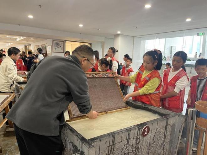 紧接着,大巴车载着满车好奇的小朋友,驶向宣纸文化园。走进展厅,大家近距离观察不同品类的宣纸,聆听工作人员讲解宣纸的历史渊源与文化价值;在生产作坊,亲眼见证工匠们历经选料、蒸煮、制浆、捞纸等多道工序,将普通原料转化为“纸寿千年”的宣纸,直观感受传统技艺的精妙。当看到工匠手持竹帘,在水中轻轻一荡、一捞,一张薄如蝉翼的宣纸便慢慢成型时,现场更是响起阵阵掌声。最让人期待的“荡帘捞纸”体验环节如约而至!小朋友们戴上手套,小心翼翼地接过竹帘,学着工匠的样子尝试——有的小朋友动作过急,纸浆没捞匀;有的慢慢找到节奏,成功捞出属于自己的“小宣纸”。虽然手上沾了水,却笑得格外开心。在亲手操作中,大家不仅感受到古法技艺的神奇,更读懂了“工匠精神”不是口号,而是一代代人用心坚守的耐心与细致,小小的“非遗代表性传承人”种子,也在这一刻悄悄发芽。