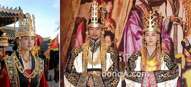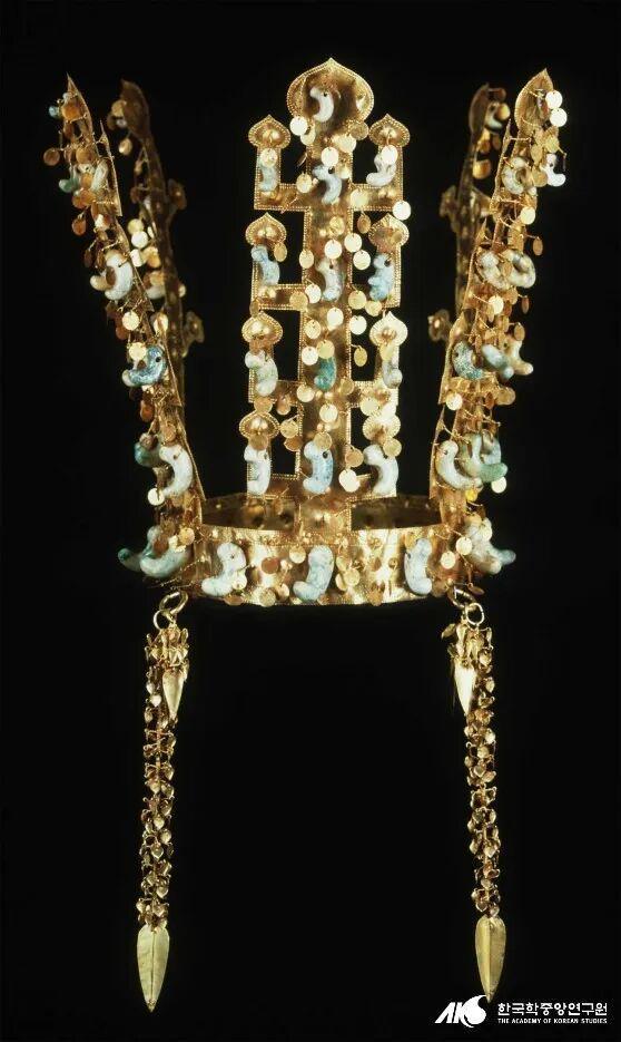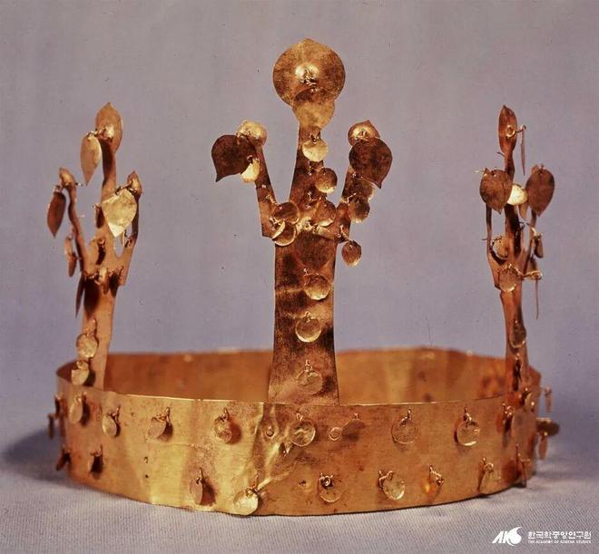 新罗金冠属于“步摇冠”系统,相关可见很久之前写过的《》和《》。相关历史背景的韩国古装里应该也见过不少了,这类金冠的圈围都比较大,从发掘看有的里面还衬有织物,装扮效果应该比古装剧里还要更华丽一些。