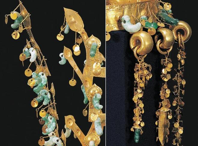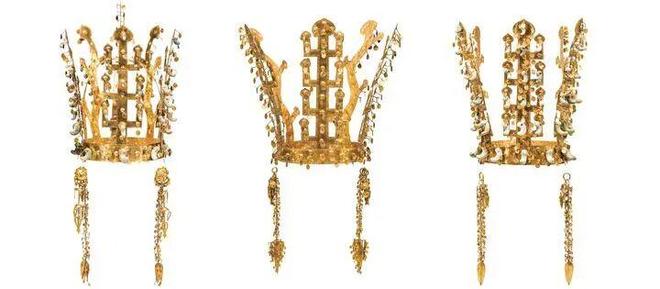 可能有人要问了,为啥不叫金冠冢呢?因为金冠冢是另外一个墓,早在1921年就发现了,也是最早发现的金冠,所以名字就被“占”了。金冠冢的金冠也十分华丽,形制与天马冢的类似(可以数“出”字立饰的层数,天马冢是4个“山”,金冠冢是3个“山”)。