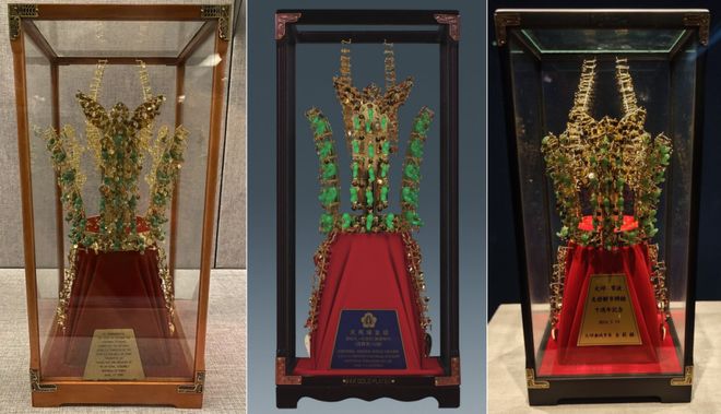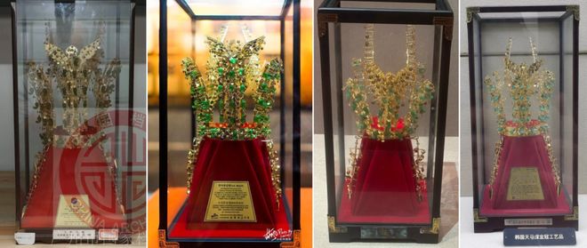 左起:广州市国家档案馆、安徽九华山大愿文化园景区、南宁博物馆、上海公安博物馆展出的金冠工艺品