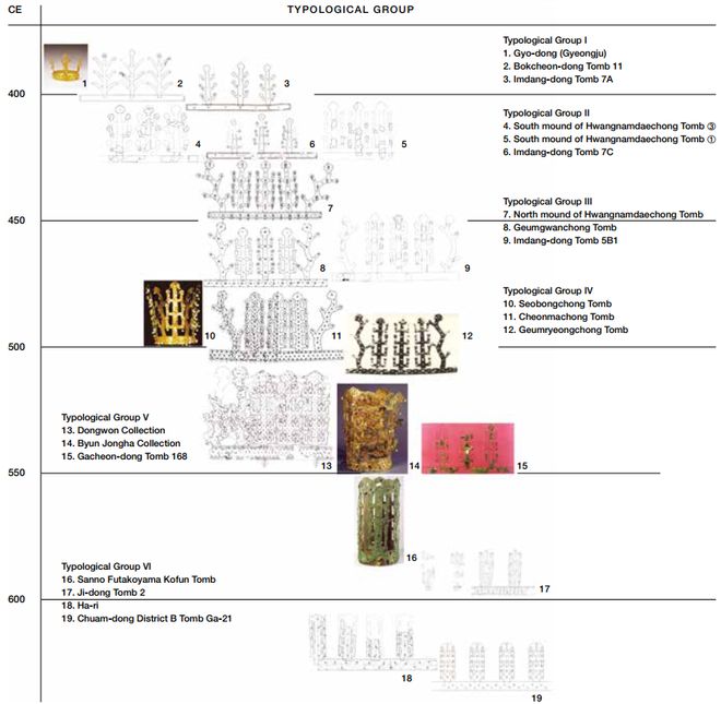 说步摇冠的时候我们往往会将它放在时间、空间都有所交流的背景下,但从出土文物来看,朝鲜半岛的确是目前考古发现最多、最完整、最华丽的地区了,它们的步摇冠出土多到不仅时间线可以串起来,类型下还不止有一个例证。