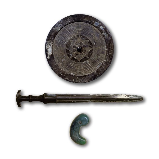 上面看起来像辣椒的,其实是非常有东北亚区域文化特征的“曲玉”(日本称“勾玉”),在日本和朝鲜半岛发现得非常多。具有类似中国传国玉玺般色彩的日本三神器之一就是“八尺琼勾玉”(不过目前谁也没见过这三神器,网上都是假想图),已具备神话与政治意义。