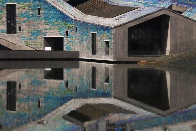 王澍以“城山相映”为核心理念,试图以建筑语言转译秦岭,屋面角度变化模拟山形起伏,并与人工湖共同构成景观。建筑外墙采用琉璃砖与石材混砌,砖色提取自唐代青绿山水,以现代工艺重现唐三彩意象,使建筑在阳光下呈现山水长卷般的流光溢彩。内墙运用竹纹清水混凝土工艺,呼应终南山的竹林,呈现素雅质感。