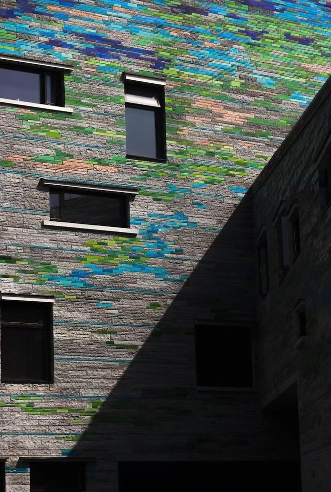 建筑面积达14.6万平方英尺(约合13,563平方米),主体结构分布于上下两层,其中大部分藏品陈列于上层空间。建筑设有多处入口,其主入口藏匿于一道斜坡之下——访客需穿越一个户外中庭空间,方可抵达高耸的迎宾廊。这里还陈列着艺术家尼克·凯夫的大型装置作品。铝制展窗巧妙内转,确保了访客在画廊内部也能获得一览无余的中庭外向视野。首席策展人朱莉安娜·奥克斯·德韦克说,“我们希望它感觉像一条开放的通道,这里的道路与校园内原有的道路走向一致。如果学生们在途中碰巧看到几件作品,并对艺术产生兴趣,那就更好了。”