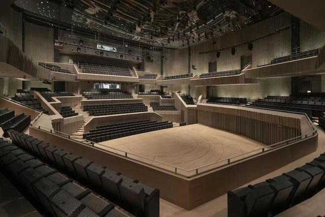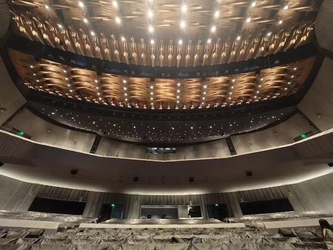 相比外观的争议,建筑内部的设施体验值得肯定。大剧院的音乐厅以“云幔清音”为理念,把木构元素带到观众厅里。木构下方,是漂浮云幔状的玻璃反声板和竹模混凝土墙面,配合顶部星空灯,不仅设计巧妙,还把传统元素和现代技术进行了完美融合。厅内座椅也颇具巧思,可开可合,适应不同场合需要。此外,歌剧院板块,则是首次实现在国内新建大型剧院中采用沉浸式音响系统。