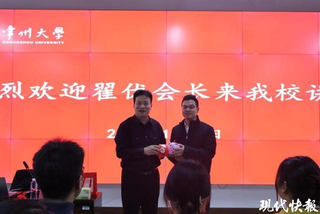 讲座尾声,学院举行隆重聘任仪式。贾韬副院长(主持工作)代表学院,向翟优会长颁发常州大学美术与设计学院特聘教授聘书,正式邀请其助力学科建设与人才培养。同时,翟优会长向学院赠送“2026马上有福——中国艺术名家翟优&樊蕾伉俪艺术衍生品”吉祥物,寓意“马到成功,福运将至”,为学院发展送上诚挚祝福。