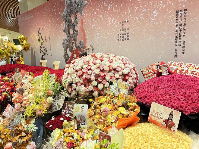 10月18日和19日,由陈丽君领衔主演的越剧《我的大观园》在四川大剧院上演。剧院三层楼的大厅被缤纷多彩的鲜花装点,宛若一座巨型花店。在一楼大堂的醒目位置,摆放着“星辰”(陈丽君粉丝名称)赠送的999朵某知名品牌玫瑰,据知情者透露,这批玫瑰产自厄瓜多尔,价值不菲,需提前多日预订方可达成。演出开始前,这束巨型玫瑰花成为全场焦点,吸引大量观众驻足合影。
