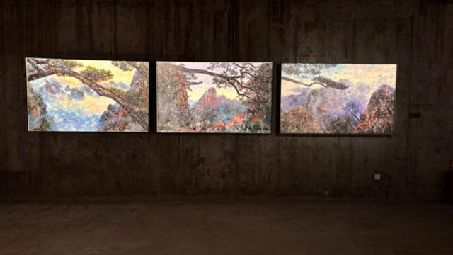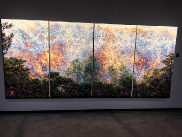 展览分为“火舞锦缠”与“云山苍茫”两大篇章。“火舞锦缠”系列灵感来源于艺术家在乙巳年新春的创作,结合冰岛火山的喷发之势与东方传统哲学,以磅礴的笔触展现生命的原始能量与时代的美好寄望。“云山苍茫”系列则突破西方印象派的框架,运用油画材料再现中国传统山水长卷的恢宏气象。