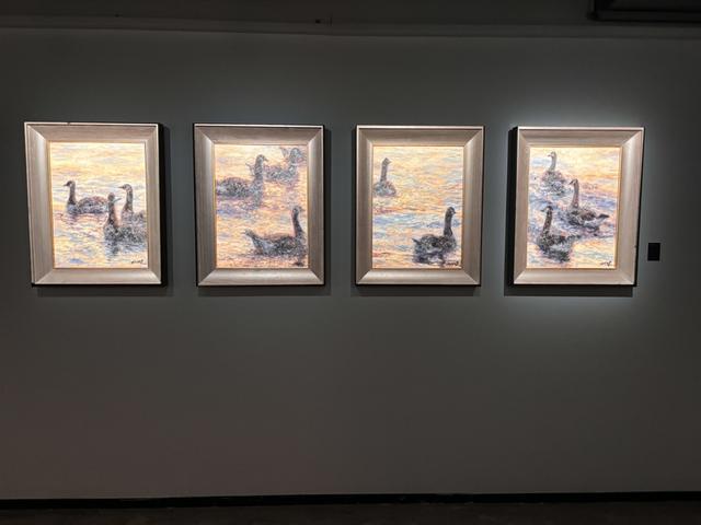 展览以“越翎欣气”为主题,通过艺术家的画笔展现自然万物的和谐共生。作品围绕金、木、水、火、土五行元素,描绘了宝矿的积淀、森林的繁茂、云的温暖、火山的炽热等自然景象,引导观众感受人与自然和谐共处的美好愿景。