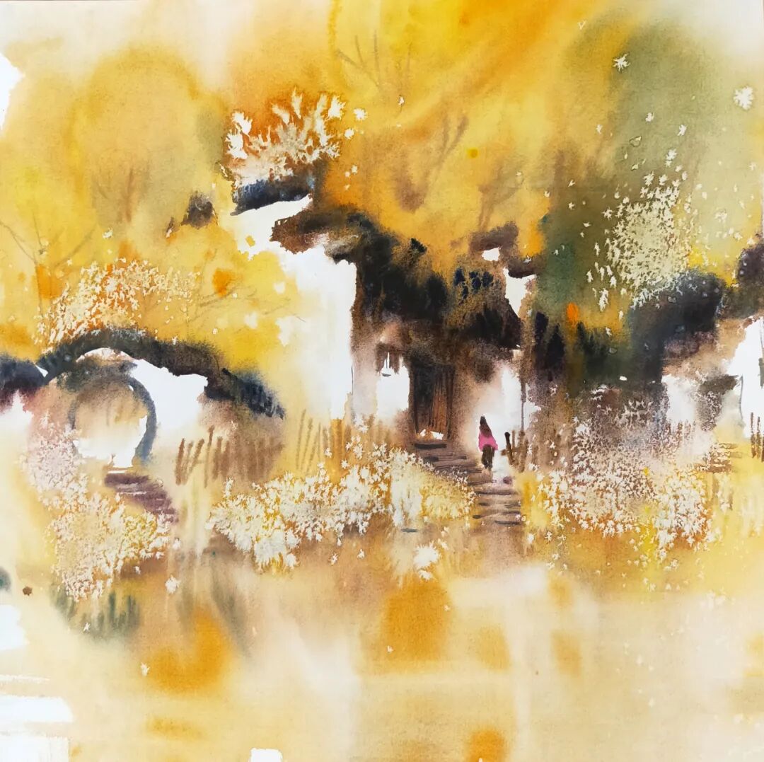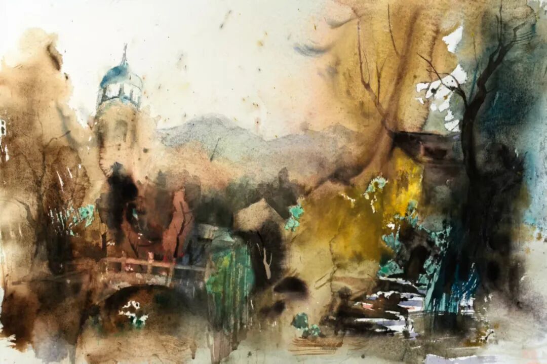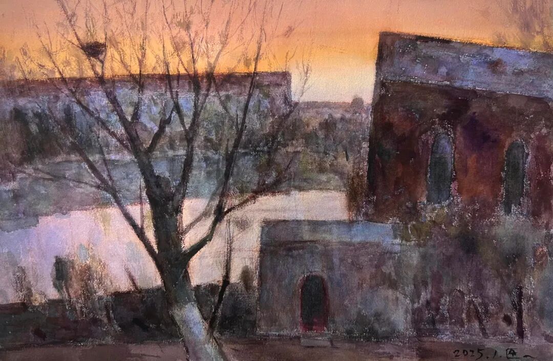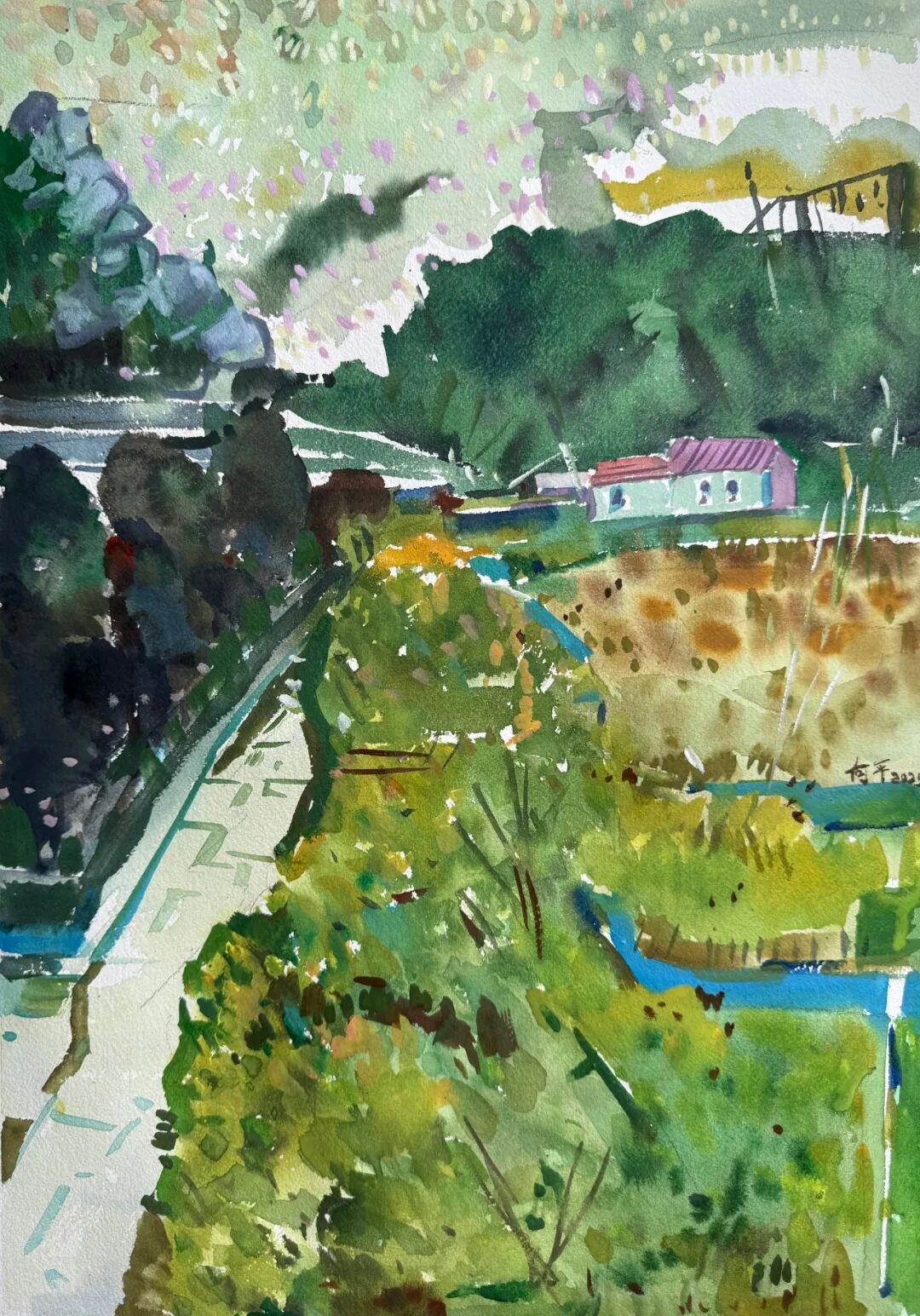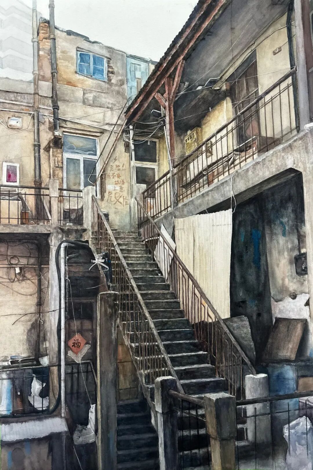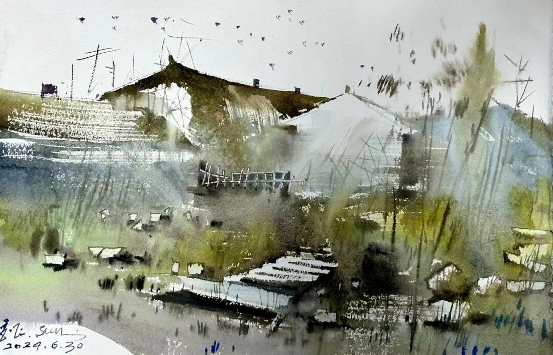 漫步于展厅之中,我们能够深切地感受到艺术家们对脚下这片土地的炽热情感。他们的画笔,既描绘着历史的厚重与沧桑,也捕捉着时代的脉动与鲜活。这里有对传统民居的深情凝视,在斑驳的砖瓦与光影间寻觅岁月的故事;也有对现代都市的敏锐观察,在水泥森林与繁华街道中勾勒出发展的线条;这里有齐鲁风物的生动写生,一草一木皆含情;也有内心世界的抽象表达,色块与线条的碰撞中激荡着思想的回响。在艺术语言的探索上,我们更是欣喜地看到了多元并蓄、百花齐放的繁荣景象。一部分艺术家坚守水彩本体语言的精髓,将水色淋漓、透明畅快的特点发挥到极致,在心灵感悟与大自然之间找到了精妙的平衡,作品充满了精神寄托感与生命力的展现。另一部分艺术家则勇于突破边界,融入中国水墨画的写意精神,或借鉴西方现代艺术的构成理念,不断拓展水彩表现的维度和深度。无论是具象的严谨,还是抽象的奔放,每一幅作品都是艺术家与自我、与自然、与时代对话的独特印记。