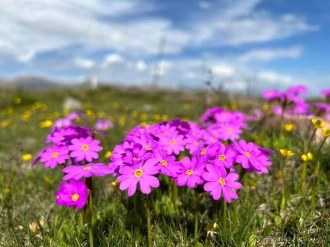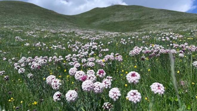 告别了学校和老师,我、次洛还有卓央——她让骑着摩托车来接她的阿爸独自回去了——步行朝着五公里开外的牧村走去。大家都不说话,默默地向前走着。我以为次洛会因为我在教室里为他的哭声发笑而生气,但他并没有。正是草原盛夏最美的季节,草原上的野花姹紫嫣红,路过丹巴大叔家的草场,看到浩荡的甘肃马先蒿把他家的绿色草场整个儿改写成了深红色,临近被我们叫作“大河”的河流时,一片天山报春把河岸染成了粉红色。在伏俟城遗址脚下,一大片瑞香狼毒随风摇曳,让草原有一种动荡不安的感觉。那天,天空蔚蓝,肥胖的白云慵懒地躺在半空中睡意沉沉。一只云雀忽然蹿上天空,把一串华丽多变的啁啾声撒遍整个天地。也许是我们一直没有说话的原因,那声音听上去响亮、嘈杂,甚至有些刺耳。我们不约而同地登上了伏俟城遗址的城墙。伏俟城遗址曾是历史上的古老民族吐谷浑的都城,我给次洛讲过这个民族在这里培育中国著名的良马青海骢的故事。次洛对此很感兴趣,在他的想象里,这里就是孙悟空在天界当弼马温时放马的地方,用他的话来说,我们的家乡就是天堂。