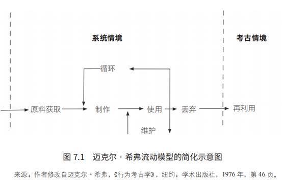 行为考古学家通常更关注文化内部的行为。他们的目标是发现人类行为的规律,而这些规律会在考古遗存中得以显现。人工制品制造和使用的时代背景称为“系统情境”(systemic context,人工制品所处的社会文化系统),而人工制品被丢弃及最终被发现的空间背景称为“考古学情境”(archaeological context)。在系统情境(物品的制作与使用时)和考古学情境之间,人工制品的不同形式是由“转变”造成的。如下图所示:
