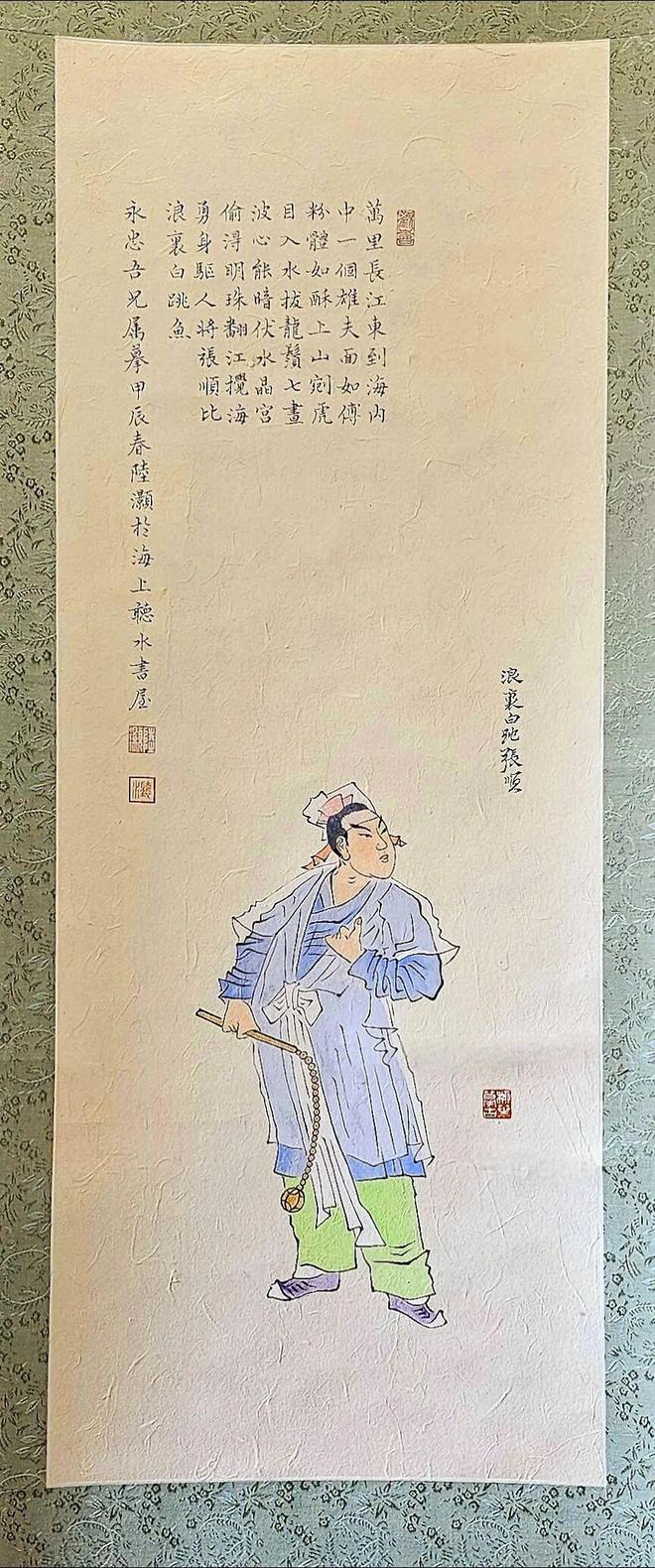 此番阅读沈胜衣,如入一处锦绣花乡,美景妙笔,俯拾皆是。此处单取几段人与人之间的彼此描述,最能表达我对沈郎的美好印象。如云也退文章《孤高清白之美》写道:读《书房花木》可“知一个心思缜密的人可以如何将关于光阴的思量化入花木审美之中,化得清隽婉转,既博且雅”。此段文字,点到沈郎做事为文的基本特质,实为妙说。再如:一是谷林,他的《书简三叠》是写给三位朋友扬之水、止庵、沈胜衣的书信集。谷林在序文中逐一绍介对他们的印象,关于沈郎,他写道:“至于沈胜衣则别是一奇。我读他文字多不自报刊,几乎悉数是他伴同手简用‘忆水舍笺’一般规格的大张素纸打印寄来。博观深情,自是一绝。好法书名画,每以彩色缩印于笺纸一角。对港台影剧歌咏,又独具心眼,自称有‘声色之好’。”反过来沈郎写谷林:“慈眉善目,眉发俱白,长身如鹤,翩然若尘外高人。欢喜相认,便随老人穿过院落,来到他的房子。”(《笔记》)二是扬之水,她与沈郎相交甚好,曾为沈著写过两篇跋文。她在《书房花木》跋中写道:“宋人咏春句云:‘春晴也好。春阴也好。著些儿、春雨越好。春雨如丝,绣出花枝红袅。’(蒋捷《解佩令·春》)或可移来为胜衣君的文字作赞。”又见沈著《岁时花事》记载,沈郎引退后,适逢七夕,他带着白居易、陶渊明的书去登庐山,却接到扬之水安慰他的好话:“前半生是香山后来,后半生是五柳再世,舍此岂还有更理想的人生?”三是陆灏,也是沈郎的好友。沈郎评价陆灏:“陆灏有一份洒脱与颓废,狷介与随意混而为一的性情,他说自己是一个趣味主义者,做事出于兴趣,如果别人不喜欢,他就不干好了。”再说沈郎喜读《水浒》,最喜欢其中人物浪里白条张顺。他曾两次到西湖涌金门参拜张顺铜像,写文章借《水浒》张顺之眼,道出眼前风光:“西湖水色拖蓝,四面山光叠翠。”又请陆公子摹绘张顺画像(下图),公子画中人物的衣裤设色,恰好就是“拖蓝叠翠”了。