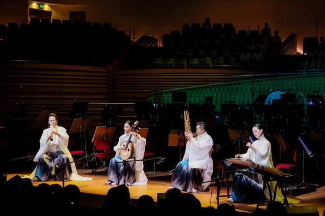 随着旋律流转,《江河滔滔》用混声合唱与童声合唱的交织、乐队的雄浑演奏,铺展开“牧野洋洋”“与子同袍”的历史长卷。音乐在冲突与融合中前行,将华夏文明一次次内外交融的历程,转化为不断发展的内在动力,展现文明兼收并蓄的宽博胸襟。《朝日流霞》则画风一转,琵琶的清脆、笛子的悠扬、箜篌的空灵与人声的苍茫交相辉映,“胡旋若风,剑器如龙”的盛唐气象扑面而来,李白“天生我材必有用”的豪情在器乐对话中展现得淋漓尽致。