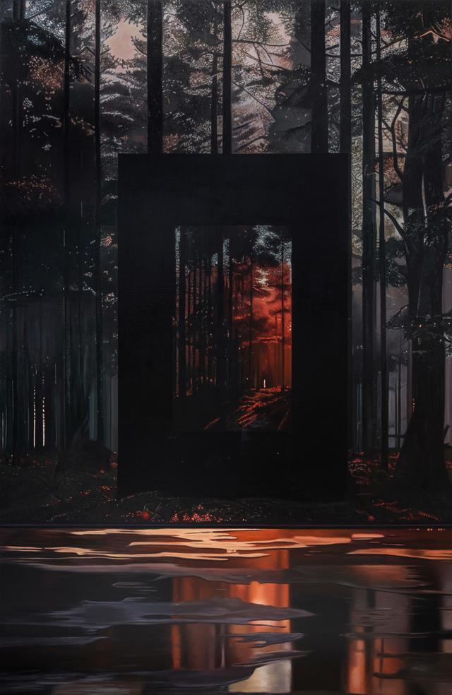 “洞穴”是杨伯都创作中的一个重要意象。在她神秘又充满戏剧性的风景中,总有一个充满禅意的小小洞穴悬于半山,成为画面的中心,如同黑鹰与白鹰的巢穴,提供面对逝去与黑暗的勇气和安宁。