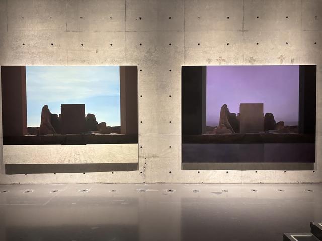 除了洞穴,“潭水”是展览的另一核心意象。在下沉的步道中,艺术家塑造了一个由潭水、建筑般的岛屿及四周数十件相似画作组成的幽深世界。观众“移步换形”间,现实与记忆更替,画面与倒影交织。