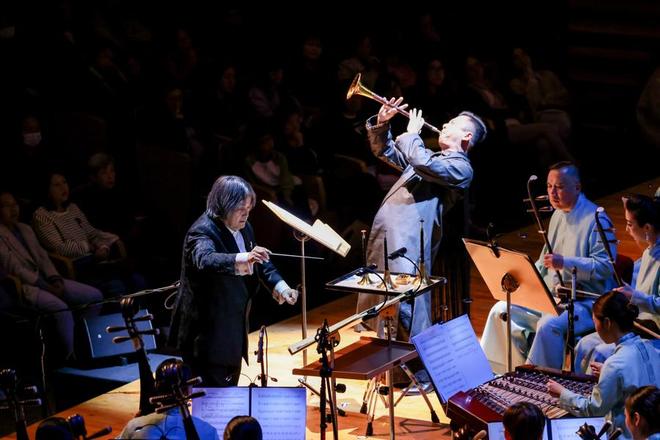 如果说前三篇章是文明进程的宏阔叙事,那么《空山月明》则是一次心灵的静谧回归。尺八的幽玄、笙的温润、古筝的清澈、阮的醇厚交织成室内乐重奏的雅致氛围,将“采菊东篱下”的闲适、“行到水穷处”的从容转化为听觉意象,在音乐的留白与韵律中,让观众体悟到中华美学特有的超然境界。紧接着,《风骨铮鸣》以唢呐与乐队的激烈竞奏打破宁静,高亢的唢呐与雄浑的乐队形成强烈碰撞,将“待从头、收拾旧山河”的赤诚与“人生自古谁无死”的丹心抒发得酣畅淋漓,勾勒出民族精神中永不屈服的刚毅底色。