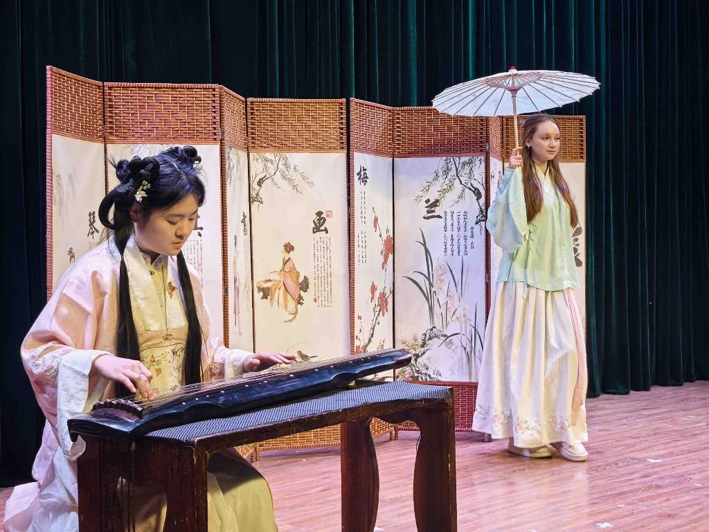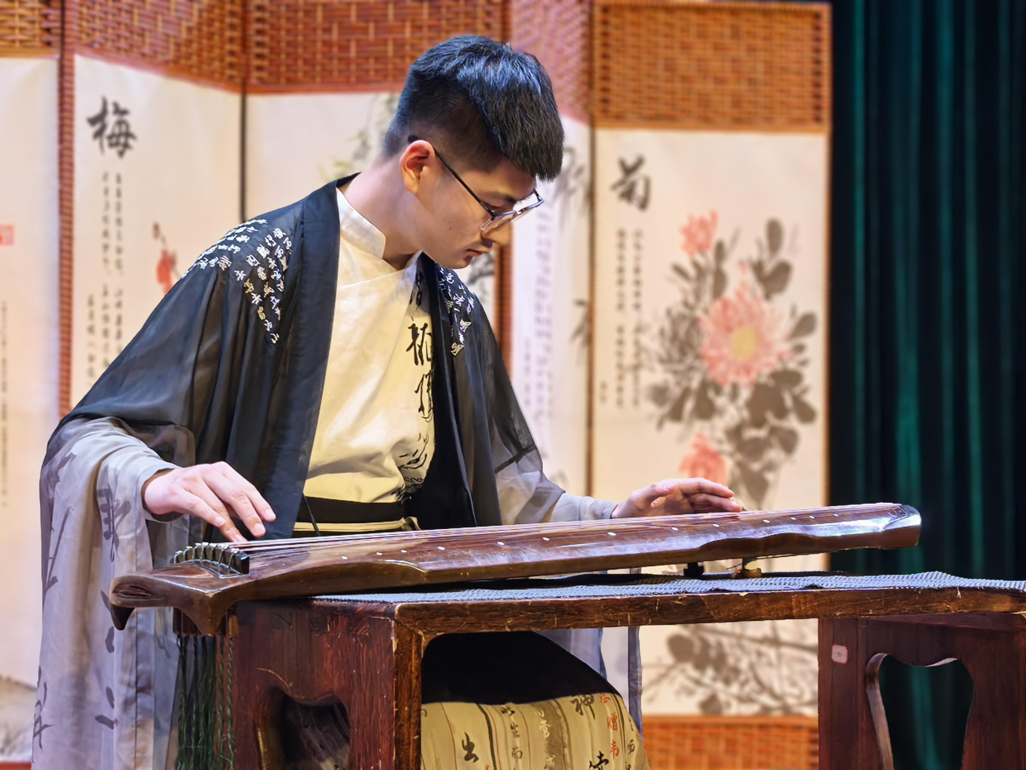 本次音乐会最引人注目的亮点之一,是外国留学生群体的积极参与。在《龙文》演出环节,黑龙江外国语学院的外国留学生代表身着典雅汉服登场展示,衣袂飘飘间尽显中华传统服饰之美,与悠扬琴音相得益彰;《秋风词》演奏时,来自俄罗斯、哥伦比亚等国家的留学生深情诵读古典诗词,中外语言的交融与古琴旋律完美契合,为传统曲目注入了跨文化的独特韵味,充分体现了古琴艺术跨越国界的感染力,也成为中外学子文化交流的生动缩影。