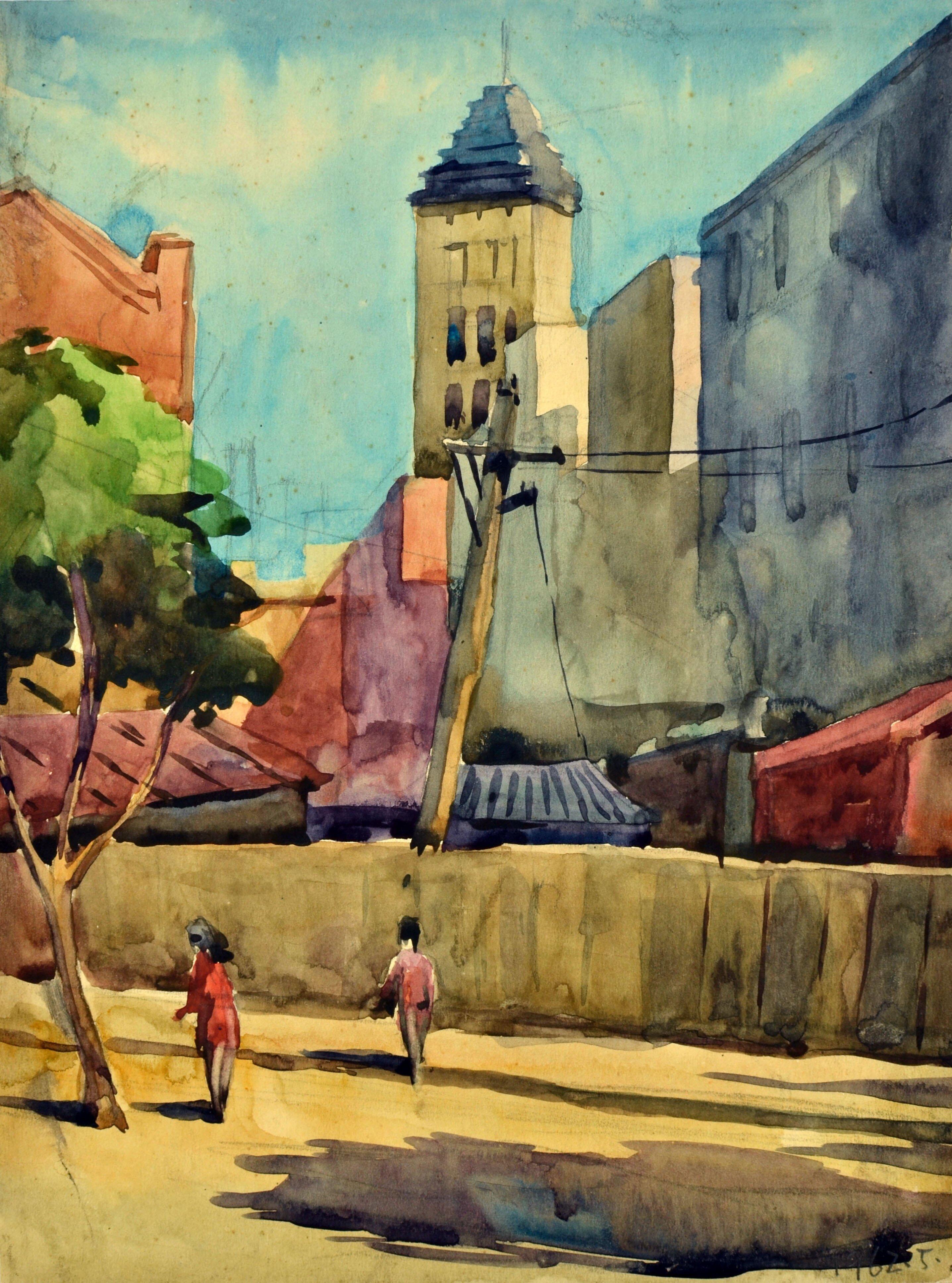 这幅用水彩颜料画在16开纸上的街头写生习作,画面上的主体是黑龙江日报“笔尖楼”,写生的位置就在黑龙江日报社后身的电车街上。从画面看,街上行人稀少,除了“笔尖楼”几乎见不到什么高大的建筑物,不似如今高楼林立、车水马龙的景象。