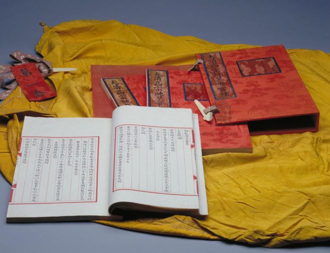 《清实录》,采用宫廷御用白鹿纸抄成,每刀纸的边口钤有不同组合的印记。故宫博物院藏。