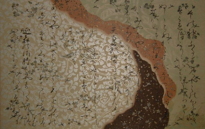 《三十六人家集·素性集》,采用继纸工艺,将染色纸、金银装饰纸、唐纸等裁剪、撕扯后重新粘贴组合。日本京都西本愿寺藏。