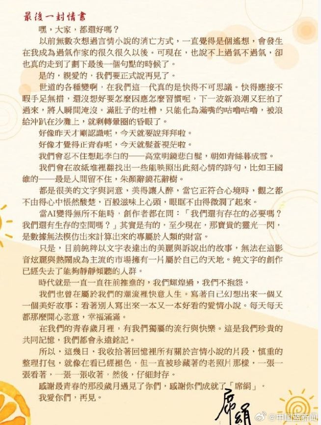 11月19日,曾写出《上错花轿嫁对郎》的言情小说作家席绢发文告别:以前无数次想过言情小说的消亡方式,一直觉得是个遥想,会发生在我成为过气作家的很久很久以后。可现在,也说不上过气不过气,却也真的走到了画下最后一个句点的时候了。是的,亲爱的,我们要正式说再见了。