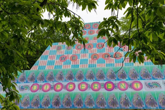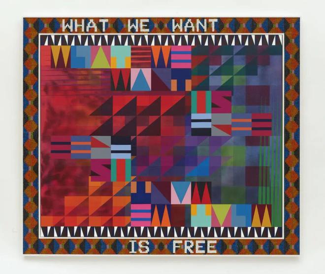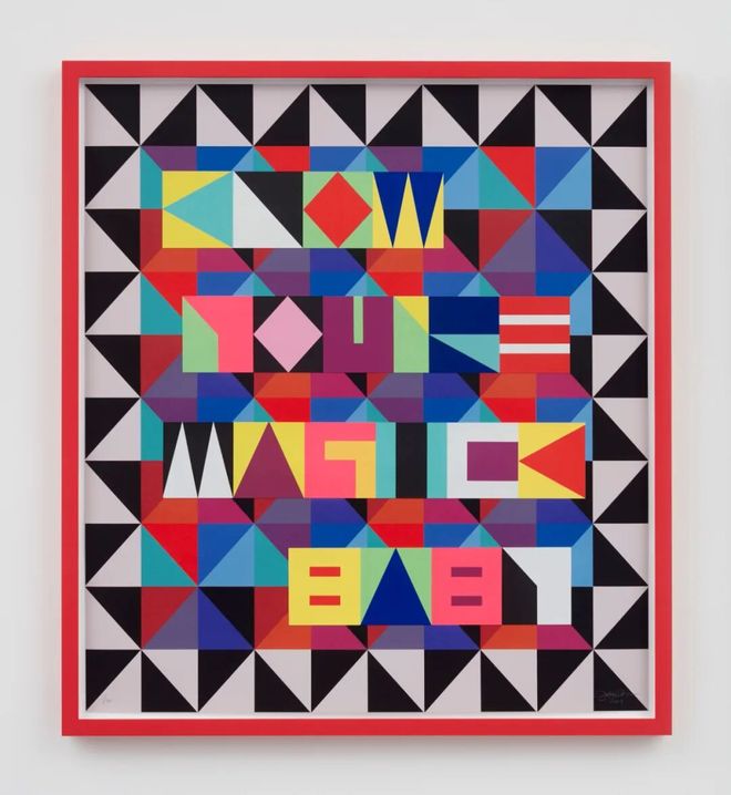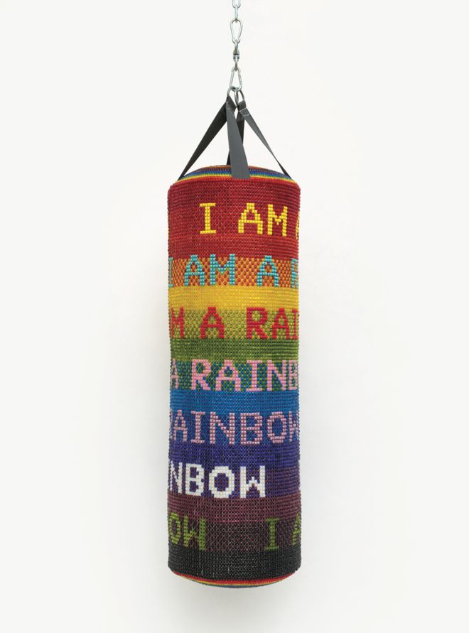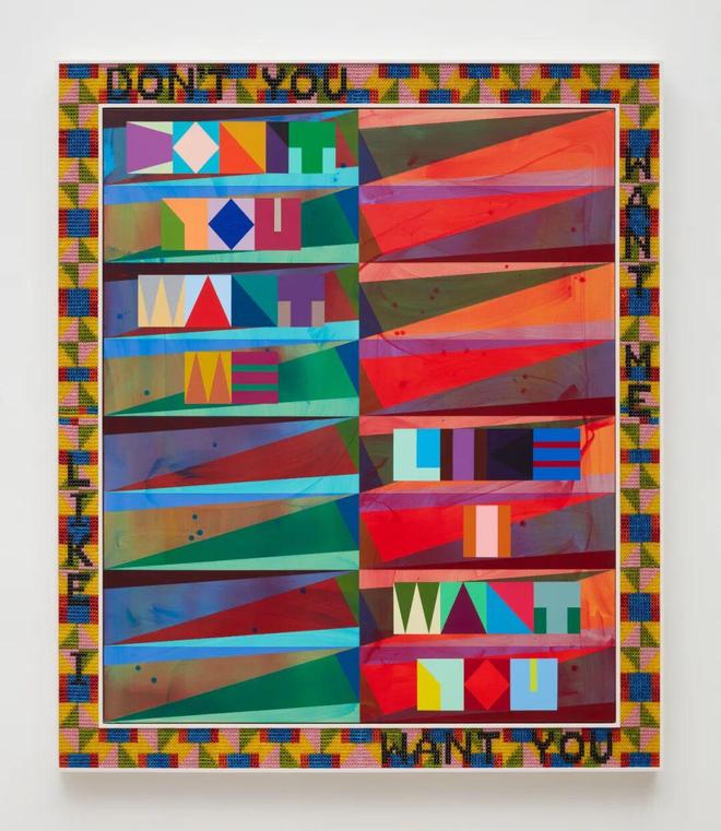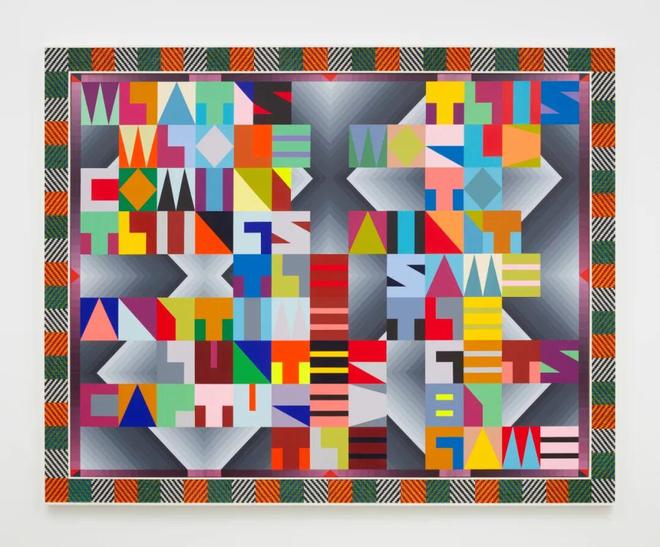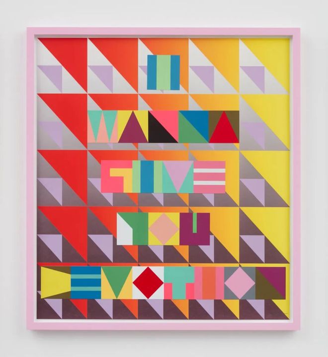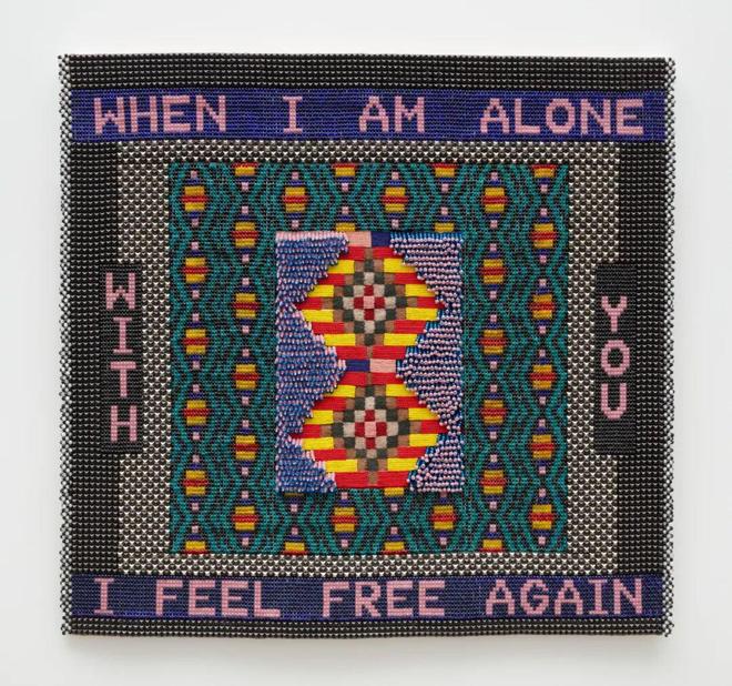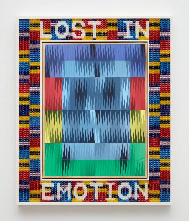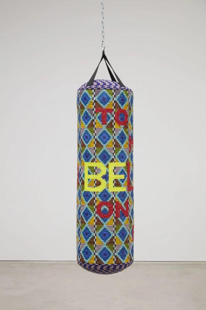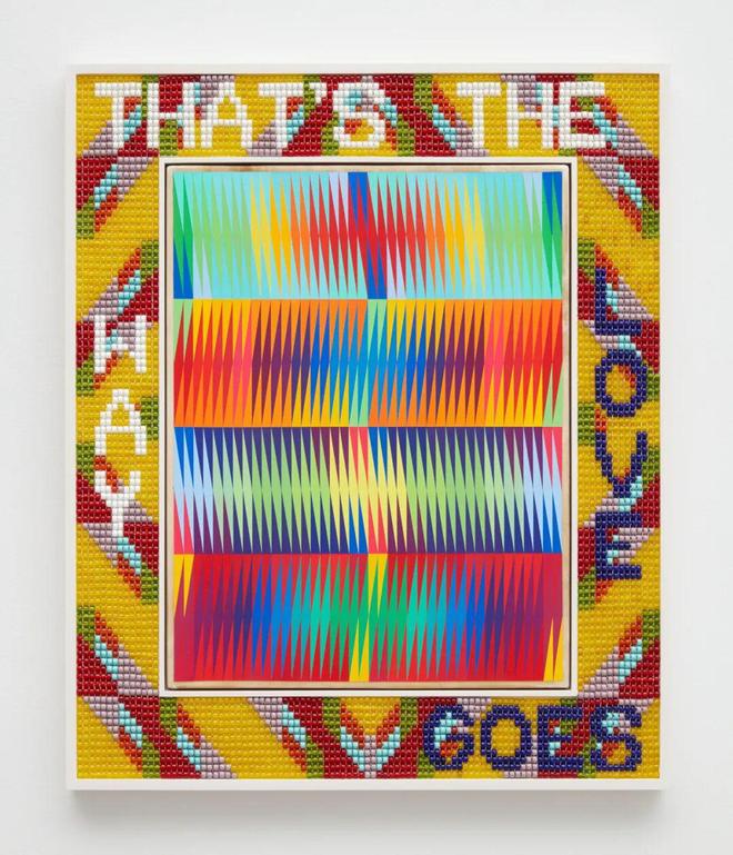 这次展览的特色包括绘画、雕塑、旗帜、壁画和一段视频。这些都是建立在吉布森最具代表性的作品之上的——一个串珠沙袋。它还包括吉布森自2010年代末以来一直展示的明亮的霓虹灯短语画,以及新形式的作品,如串珠肖像半身像。