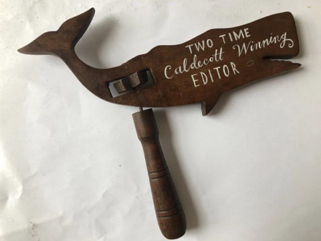 苏菲给苏珊·里奇制作的“两度荣获凯迪克奖的编辑”奖牌。是苏菲最喜欢的白鲸的形状。