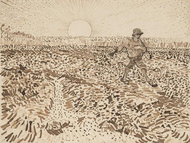 梵高 素描《夕阳下的麦田播种者》(Sower in a Wheatfield with Setting Sun,1888 年 7 月)