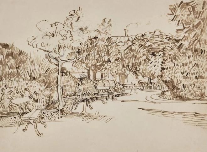 梵高《拉马丁广场公共花园长椅》(Public Garden with Benches in Place Lamartine,1888 年 4 月)素描
