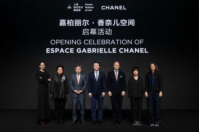 左起:香奈儿艺术、文化与传承总裁雅娜·琵尔(Yana Peel)、上海市文化和旅游局一级巡视员程梅红、法国驻上海总领事王度(Joan Valadou)、上海市政府副秘书长夏科家、香奈儿北亚区总裁柏瑞德(Renaud Bailly)、上海当代艺术博物馆馆长龚彦、香奈儿中国董事总经理夏阳(Charlotte Jozan)