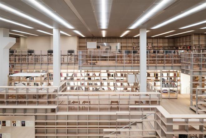 图书馆总面积为1700平方米,由日本著名建筑师坂本一成设计,从设计到实现历时十年,是此次空间焕新后最吸引眼球的区域。步入图书馆,它如一栋高低起伏的山丘,读者可在其中上下穿行,触及各式各样的、来自全球的艺术读物,但错层的空间因设计而通透舒适。图书馆中约设置了100多张座位,部分景观位可以眺望江景,部分座位可以俯瞰PSA当代馆的一层展厅。