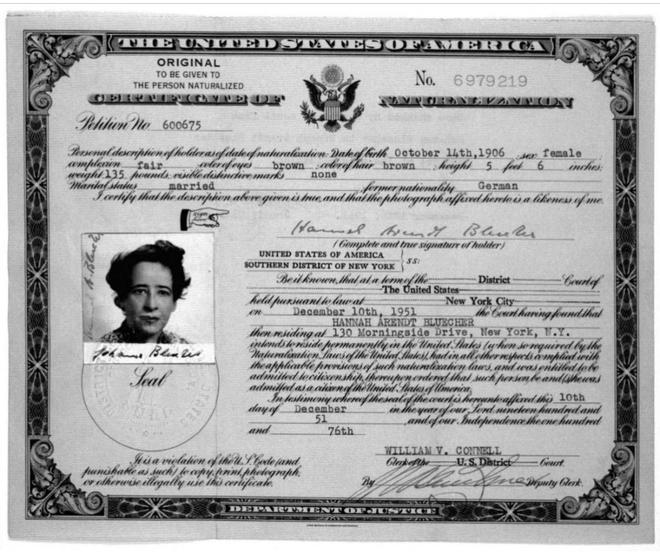 阿伦特的入籍证明(Hannah Arendt Papers: Family Papers, 1898-1975; Arendt, Hannah; Naturalization (birth, marriage, death, divorce, and miscellaneous family documents); 1940-1952, undated)。