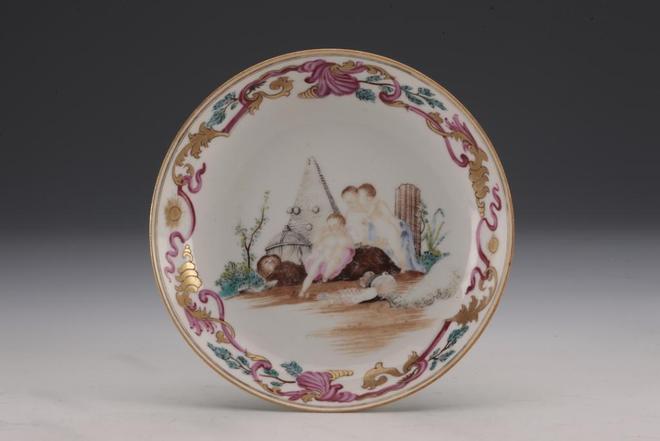 乾隆二十二年“一口通商”政策实施后,广东十三行独揽中西海路贸易之利,成为中国外销艺术品生产与集散中心。每一件展品都是一段贸易史的缩影,承载着岭南地区作为全球贸易核心的辉煌记忆。18世纪乔治‧钱纳利绘美国商馆及人物手稿,以速写形式记录了广州商馆区的热闹景象与中外贸易的繁忙;银锤胎徽章留白人物故事图执壶底錾“WH”款,见证了晚清外销银器巨头“宏兴”的商业传奇;广彩青花徽章纹瓣口杯、碟上的法语铭文“Nous Ne Changeons Jamais”,诉说着欧洲贵族定制中国瓷器的跨洋情谊。展览勾勒了彼时海上丝绸之路的繁华胜景,是那段东西方交流史的直观呈现。