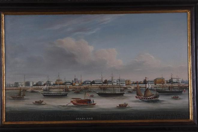 展览中一组珍贵的“外滩图像”,还原了上海开埠初期的外滩风貌,吸引观众驻足观看。这幅标注了来自19世纪广州著名外销画家南祯画室的外销画,描绘了开埠不久的上海外滩景象。