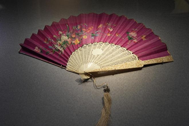 展览现场 清象牙柄徽章留白绫面彩绘人物花鸟折扇