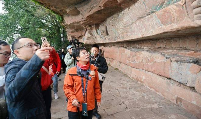 5日下午,合川钓鱼城的晚唐卧佛也引起了蒙曼教授的浓厚兴趣。图/重庆市文旅委