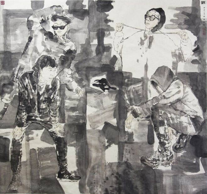 湖北省美术院的人物画创作有着极为深厚的积淀,前辈画家以充满时代气息和新中国美学趣味的作品,勾画出新中国人民的形象,为新中国美术史留下了不朽的杰作。年轻一辈的湖北省美术院画家在回溯过去的同时,将视野投射到当代社会文化领域中,将个人化的体验与时代变迁紧密结合,从而创作出具有鲜明个性的人物作品。此次参展的柳秀林、陈雪亮、雷维、王丹、王天瑜,均以人物画创作参展。柳秀林笔下的人物多为普通人,他们并无华丽的外表,给人以质朴粗犷的感受。尤其画中那些稍显木讷的人物,似乎在以厚重而斑驳的形象无言地叙述一段故事。在表现语言上,柳秀林既有注重墨色晕染的作品,如《行路人之暇》《行路人之自拍》,也有线墨结合的创作,如《行路人之集》《行路人之静谧》等,体现出他在笔墨上的两种探索。与柳秀林相似,雷维的创作也多以现实人物为题材,不过他更关注的是年轻一代,如《他们终究会长大,我们终究会变老》《面孔-1》《观》等作品。雷维擅于抓住人物动态,以简约的笔墨勾勒点染出对象,在画面中通过留白的方式构建出意象的意味,含蓄地表现出当代年轻人的生活状态和情感状态。与前两者不同,陈雪亮的人物在笔墨语言上以线为主,注重造型的概括、简约,画面风格清新。在题材上,陈雪亮的创作涉猎广泛,有表现古人的《东坡药膳侍米芾》,也有描绘当代生活的《最是橙黄橘绿时》等,这些作品呈现出丰富的样貌。王丹的笔墨语言更接近于抽象的表达,通过恣肆的笔墨和厚重的色彩,将人物造型与媒材自身的美感相融合,形成似真似幻的画面。“华章”系列中墨与色的交叠融合、《迷雾的褶皱》中迷离的墨色与虚白造成的氤氲感,都给人留下深刻的印象。王天瑜的“表情包”系列以流行的网络生活为题材,以传统的工笔方式描绘社交平台上年轻人的面貌,俏皮而又呈现出温雅的气质,反映出“90后”年轻画家的关注点和审美特征。